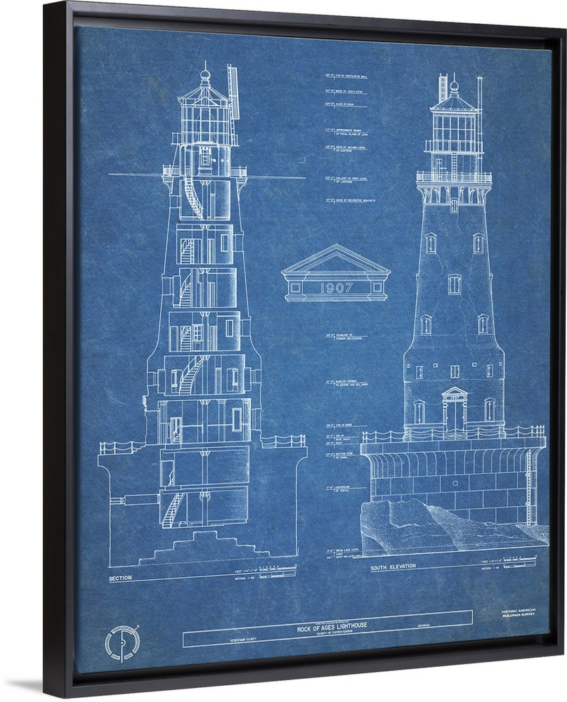 <p>Contemporary artwork in technical blueprint style of Rock of Ages lighthouse.</p>