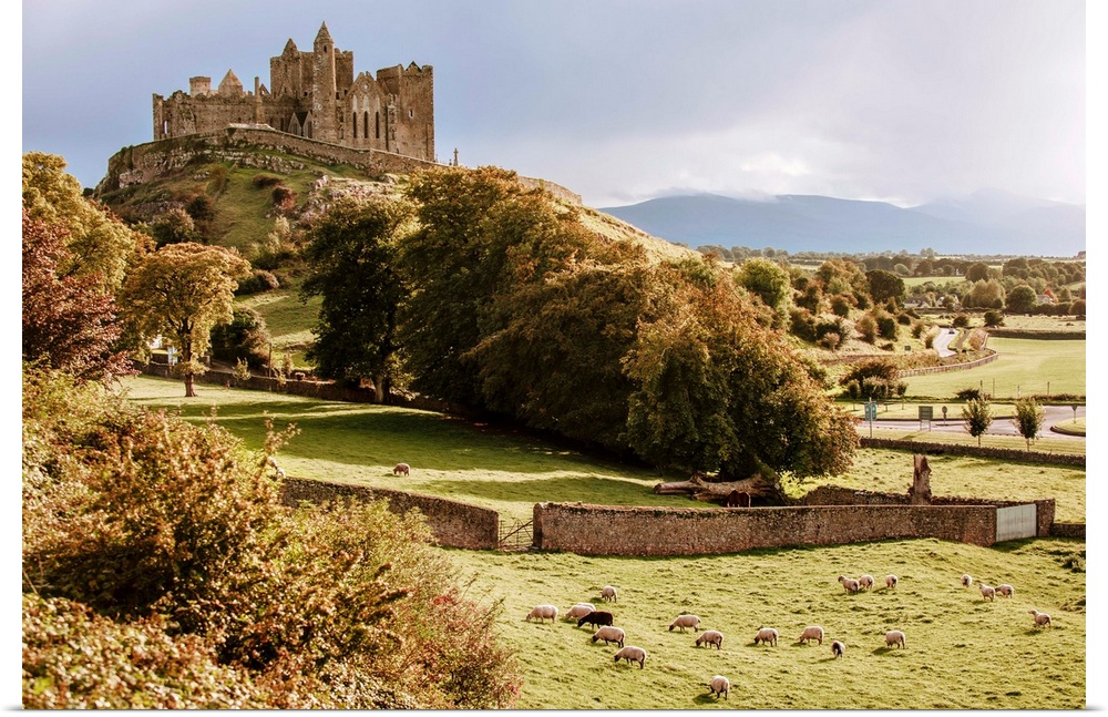 <p>Distant photograph of the Rock of Cashel located in Cashel, County Tipperary, Ireland, with a field of sheep grazing in the foreground.</p>