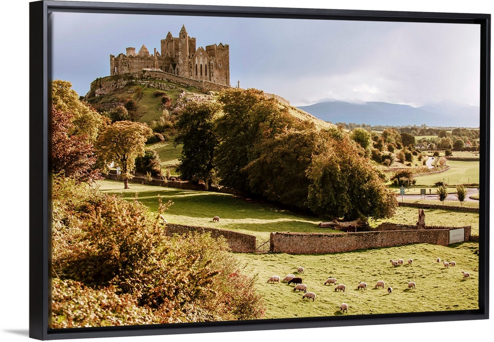 <p>Distant photograph of the Rock of Cashel located in Cashel, County Tipperary, Ireland, with a field of sheep grazing in the foreground.</p>