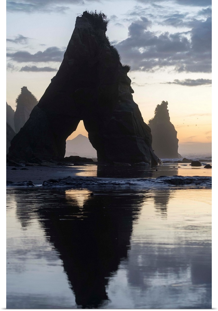 <p>Rocks reflect with low tide at the Three Sisters beach, at sunset, with Mt Taranaki seen through the rock cave. Tongaporutu, New Plymouth district. Taranaki region, North Island, New Zealand.</p>