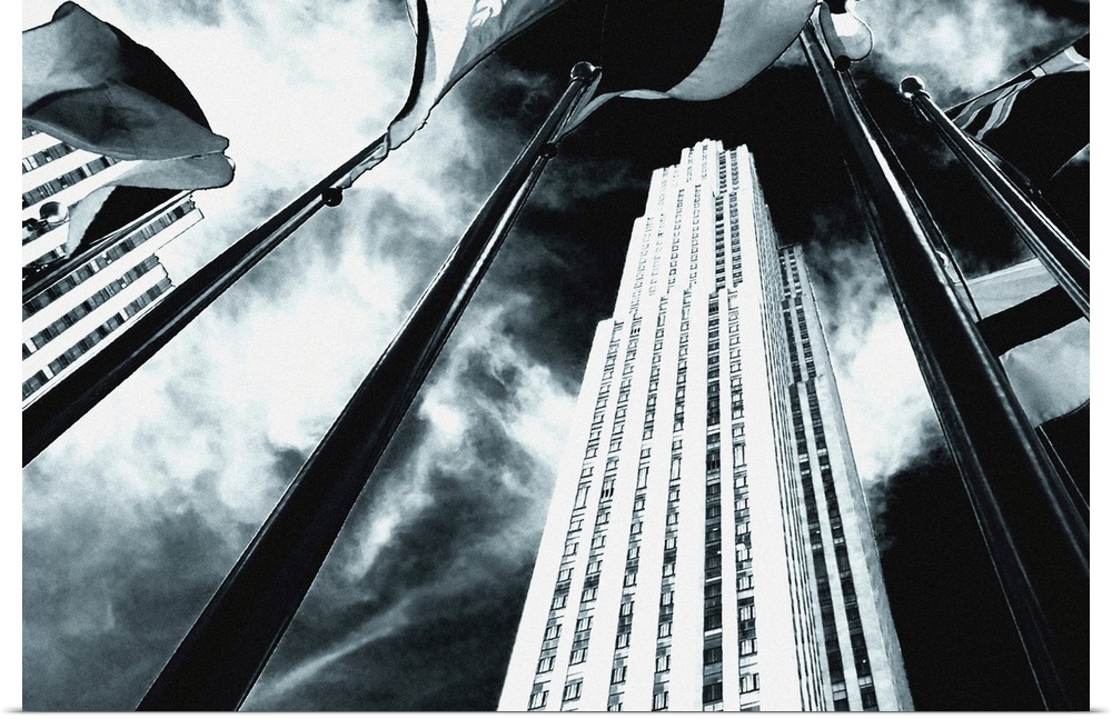 <p>Dramatic black and white of Rockefeller Center from a low angle.</p>