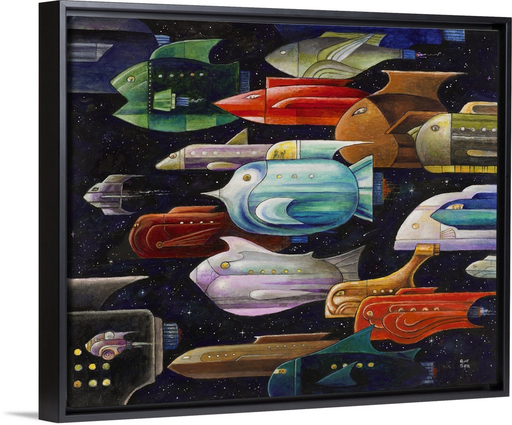 <p>A painting of a group of spaceships in the shapes of fish.</p>