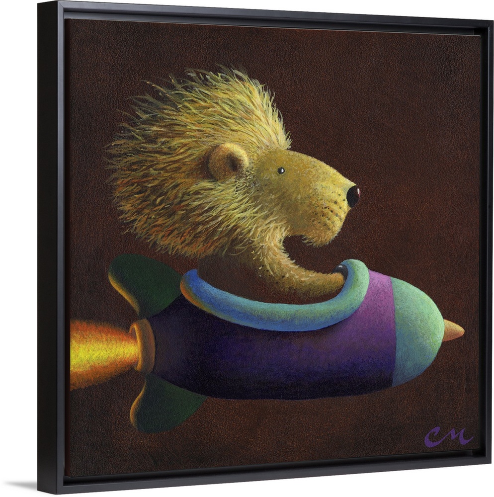 <p>Whimsical contemporary painting of a lion in a rocket.</p>
