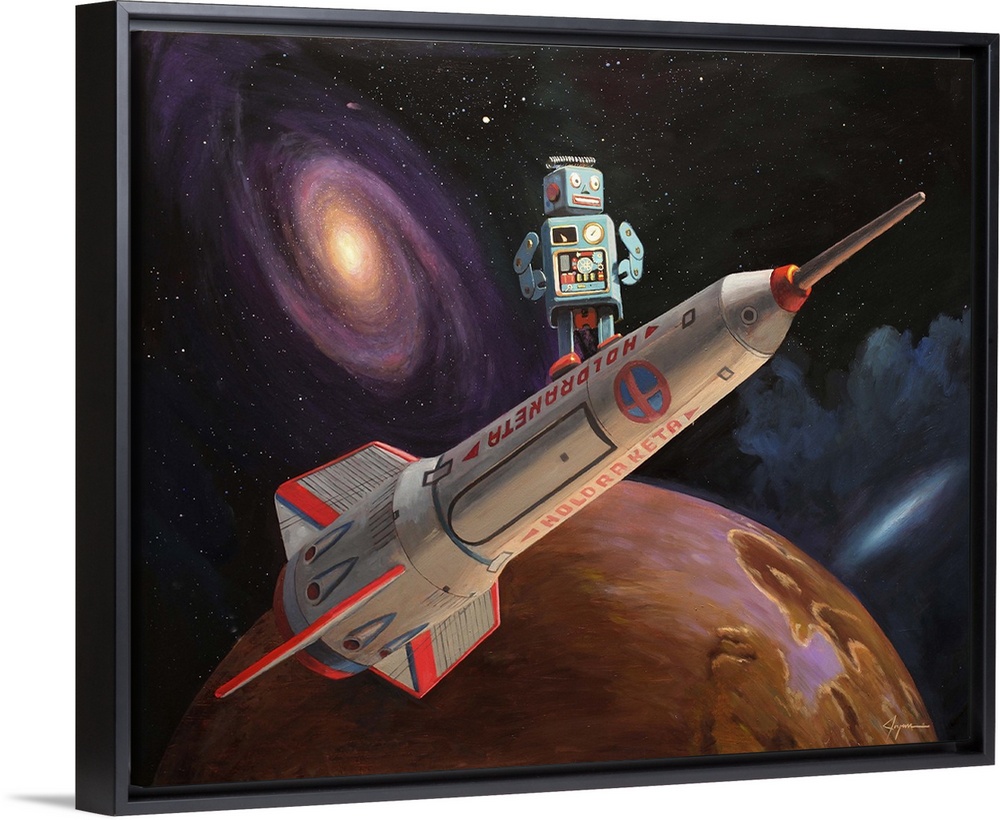 <p>A contemporary painting of a mint green retro toy robot standing on a rocket ship with an outer space background.</p>