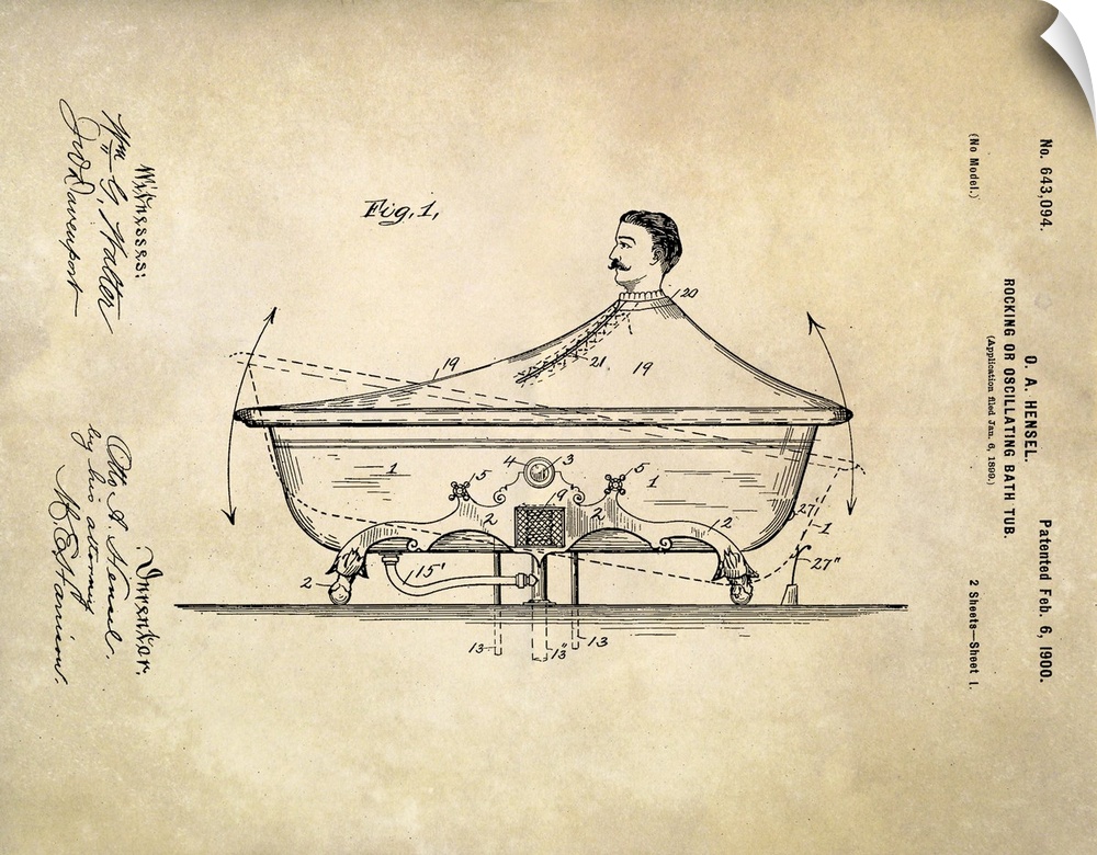 <p>Rocking bathtub patent, 1900. Artwork of a rocking bath tub designed by Otto A. Hensel. The bath tub was designed to rock forwards and backwards (dotted lines) and cause water to splash against the bather. A top cover prevented water from escaping the bath. Victorian era water therapy, known as hydrotherapy, was a popular form of treatment that claimed to cure a large variety of ailments.</p>
