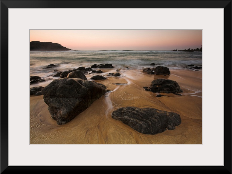 <p>Rocks and sunset at Dhail Mor beach, Lewis, Outer Hebrides</p>