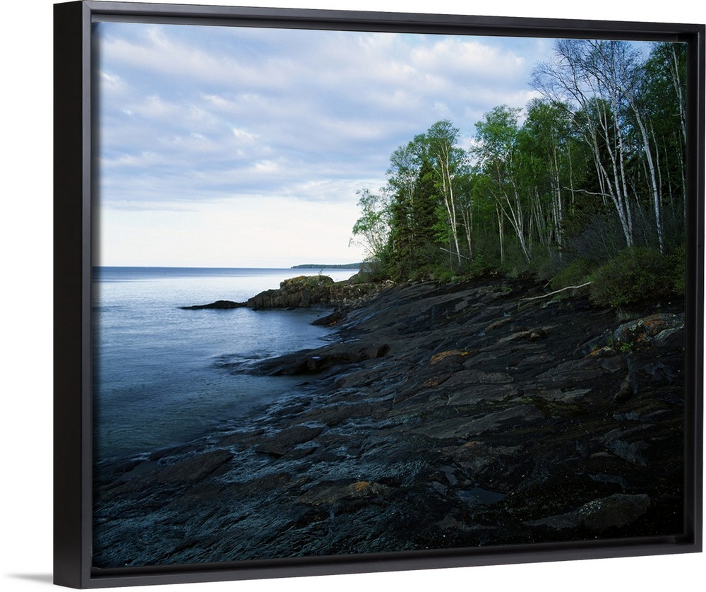 <p>Large photograph shows a dense forest next to the rocky shore of a large body of water within the Midwestern United States. In the far distance, another landmass can be seen spanning a portion of the horizon.</p>
