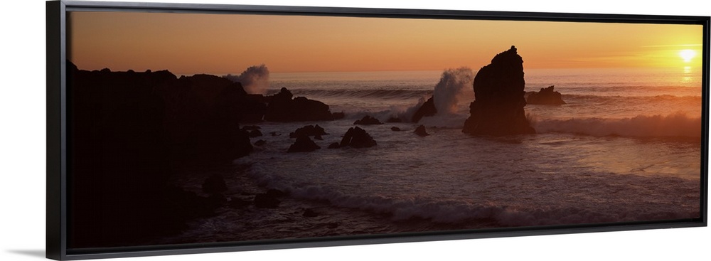 <p>Panoramic photo on canvas of rock formations on a beach with waves breaking on the shore at sunset.</p>