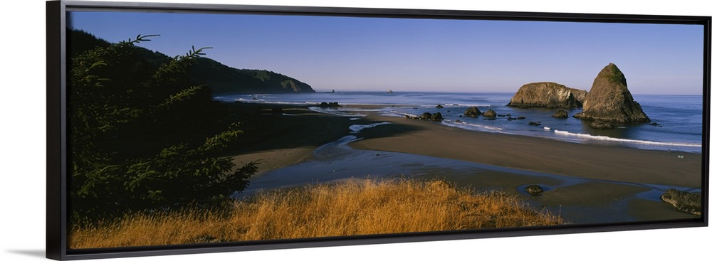 <p>Wide angle photograph looking over grasses to the shoreline on Cannon Beach, large rocks jutting out of the water, in Oregon.</p>