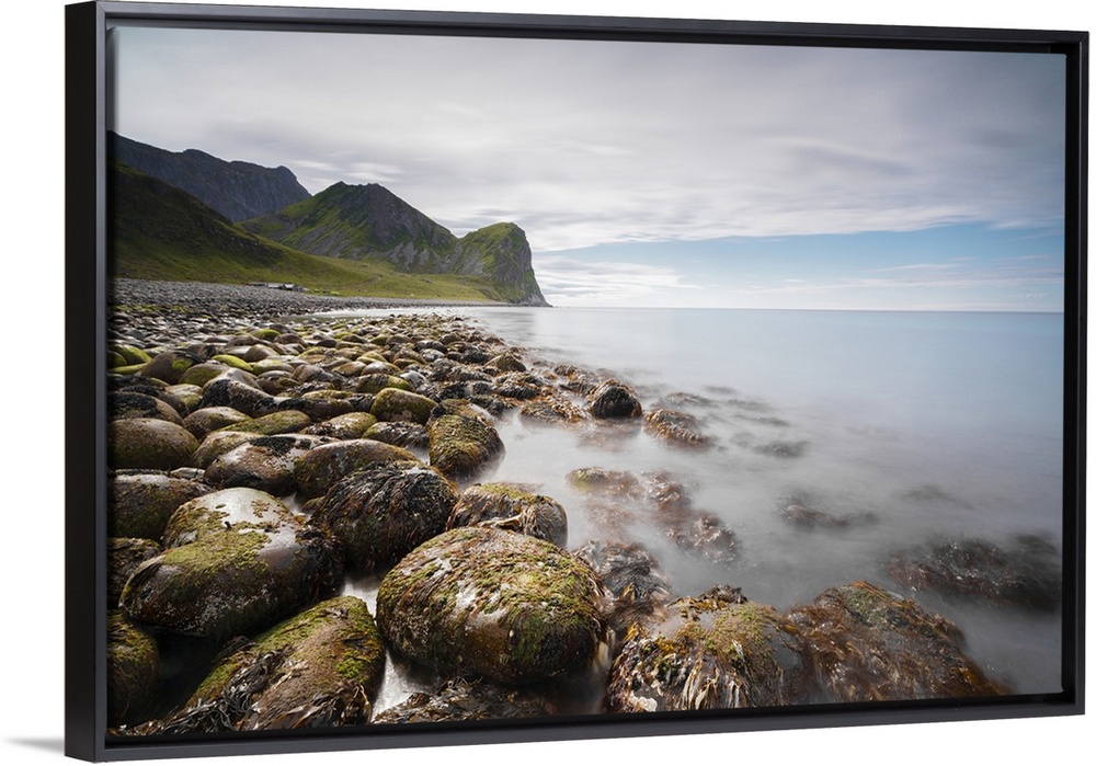 <p>Rocks on the beach frame the calm clear sea, Unstad, Vestvagoy, Lofoten Islands, Norway, Scandinavia, Europe</p>
