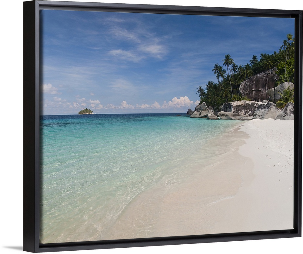 <p>Square photograph on a big canvas looking down the shoreline of clear blue water and white sands on Pulau Dayang Beach, a large rocky hillside covered in palm trees sits at the edge, in Malaysia.</p>