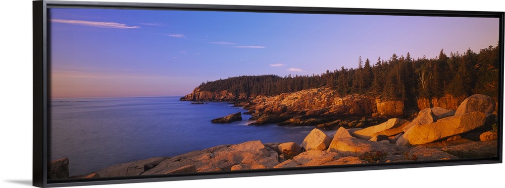 <p>Wide angle photograph of the rocky shoreline, surrounded by trees at sunset, in Acadia National Park, Maine.</p>