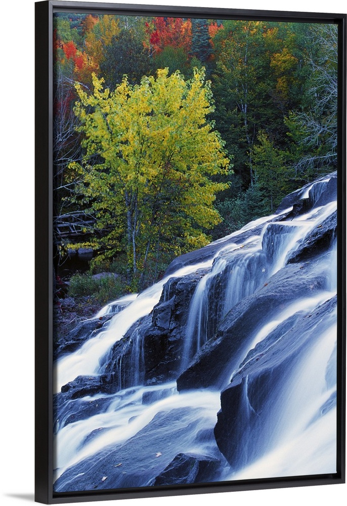 <p>Tall photo on canvas of water rushing down a large waterfall with fall foliage in the background.</p>
