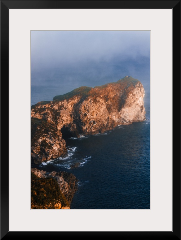 <p>Rocky cliffs in the fog near Kinbane Castle in Northern Ireland during a winter sunrise.</p>