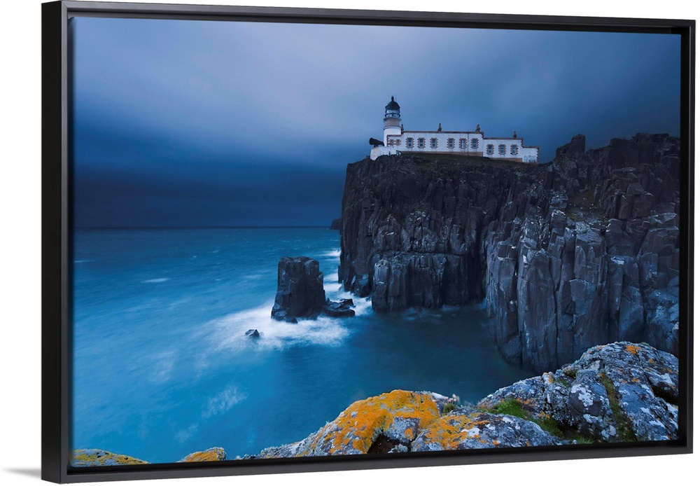 <p>Rocky cliff on the sea, with a lighthouse on the reef, Neist Point, Isle of Skye, Scotland, UK.</p>