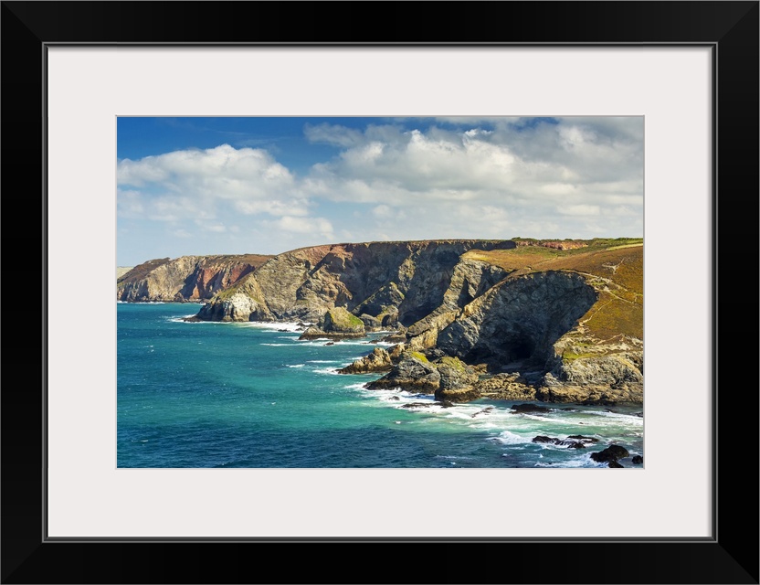 <p>Rocky cliffs along the shoreline with clouds and blue sky; Cornwall County, England.</p>