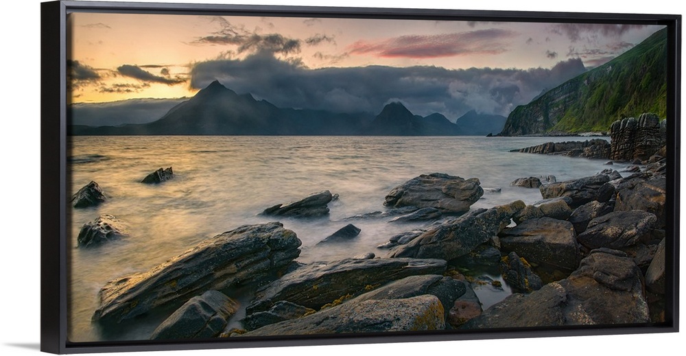 <p>Rocky coast of Loch Scavaig with Cuillin mountains at sunset, Isle of Skye, Scotland.</p>