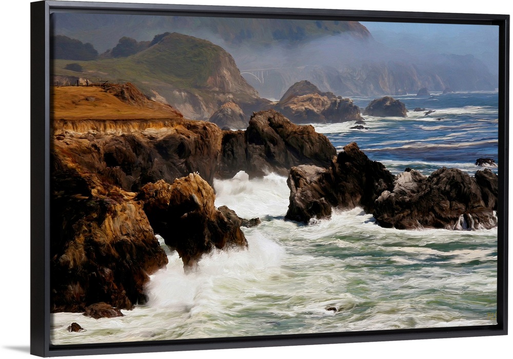 <p>Seagulls perched on a rock formation have a spectacular view of waves crashing on the rugged Big Sur coast. In the distance, shrouded a little bit by incoming fog, is the Rocky Creek Bridge, over which passes Highway One. Acclaimed artist Michael Lynberg adds an impressionistic touch to his work, making each piece unique and alluring.</p>