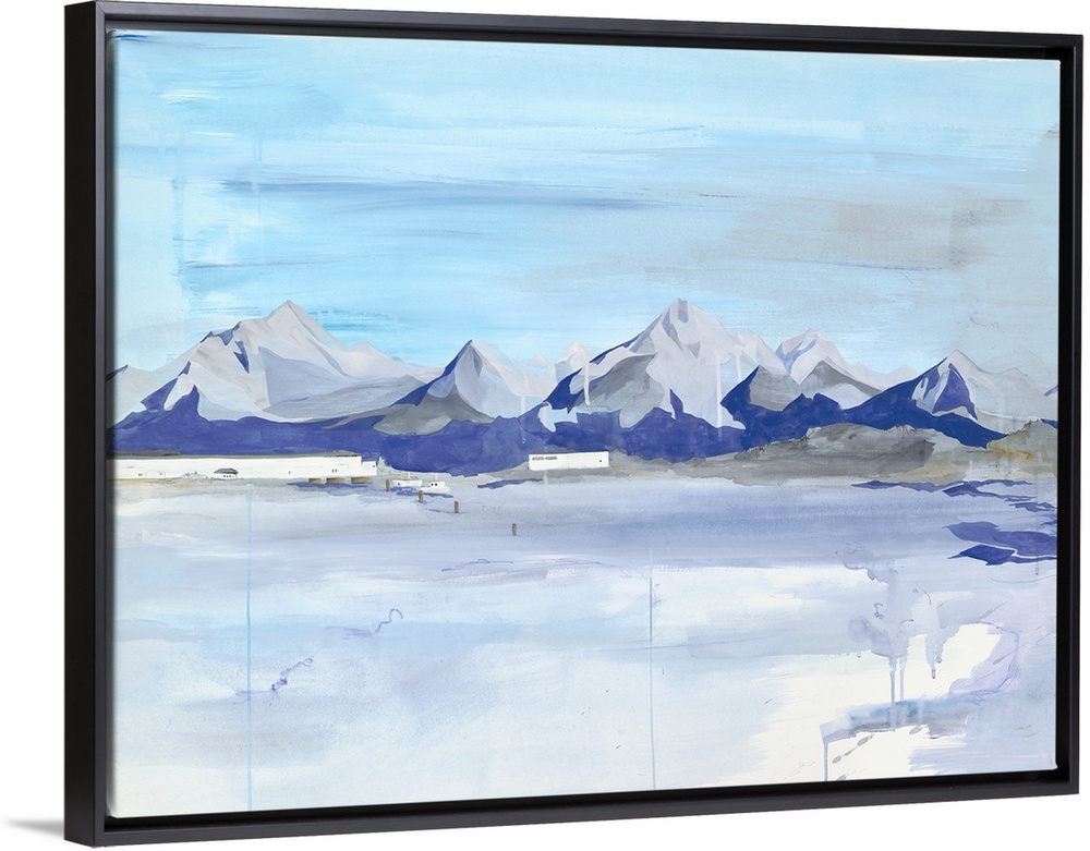 <p>Contemporary painting of a mountain range on the horizon.</p>