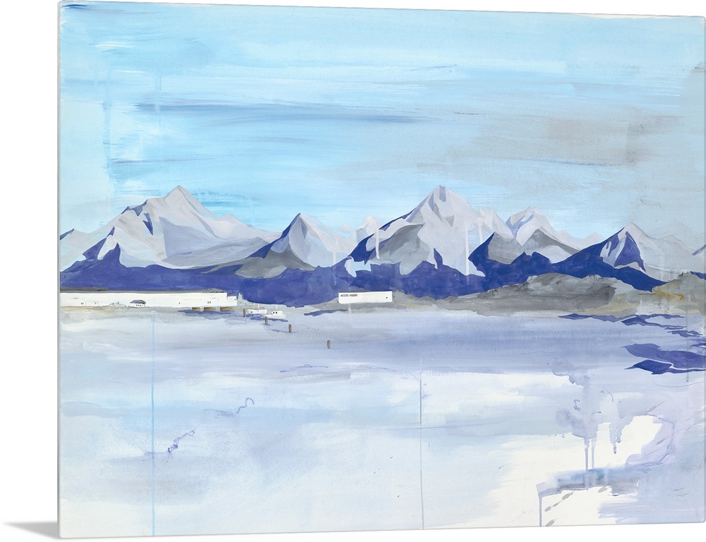 <p>Contemporary painting of a mountain range on the horizon.</p>