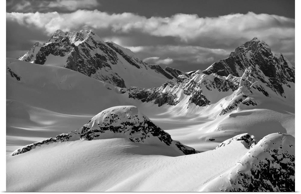 <p>Rocky monoliths and towers reach for the sky through thousands of feet of glacial ice on the Juneau icefield in Alaska's tongass national forest, Alaska, united states of America.</p>
