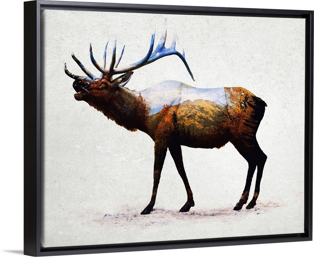 <p>A contemporary piece of artwork of a wilderness scene withing the outline of an elk.</p>