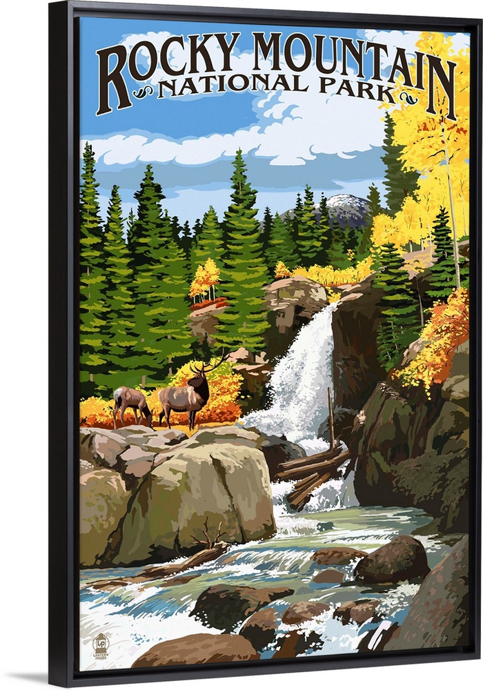 Art Landscapes Waterfall Lantern Press United States Colorado Rocky Mountains Moose and Elk