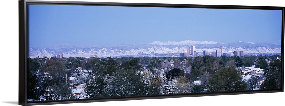 <p>Panoramic photograph on a large wall hanging of a snow covered landscape surrounding houses in front of the city skyline and Rocky Mountains in Denver, Colorado.</p>