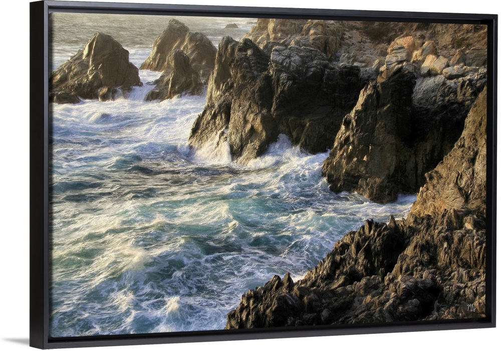 <p>Lying chest down on a rocky cliff about 40 feet above crashing waves, Michael Lynberg captured this remarkable meeting of land and sea. Light from the setting sun dances on the waves and shines from some of the rocks. The teals and blues of the water complement the browns and blacks of the chisled rock formations. The highlights and shadows combine to give the artwork remarkable texture and depth.</p>