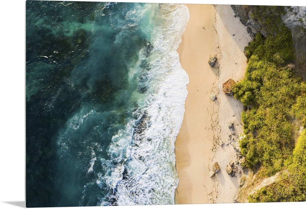 <p>View from above, stunning aerial view of a rocky shore with a beautiful beach bathed by a rough sea during sunset, Nyang Nyang beach (Pantai Nyang Nyang), south Bali, Indonesia.</p>
