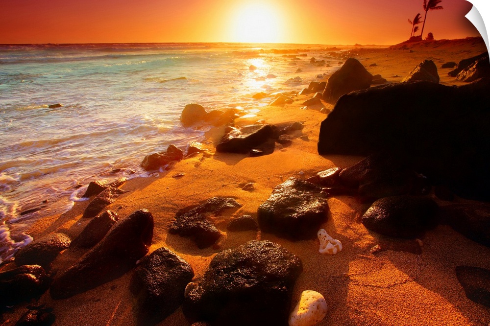 <p>Photograph taken of a sunset on the ocean horizon with various rocks spread out on the beach in the foreground.</p>
