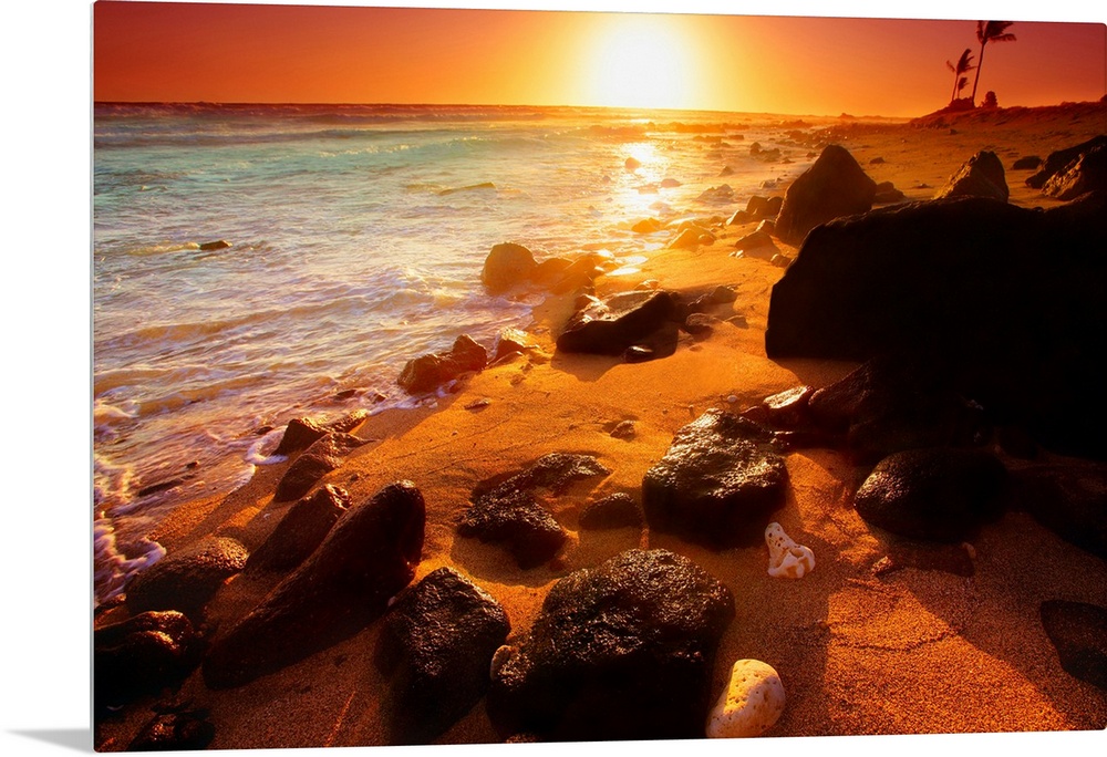 <p>Photograph taken of a sunset on the ocean horizon with various rocks spread out on the beach in the foreground.</p>