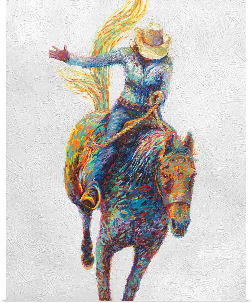 <p>Brightly colored contemporary artwork of a woman riding a horse.</p>