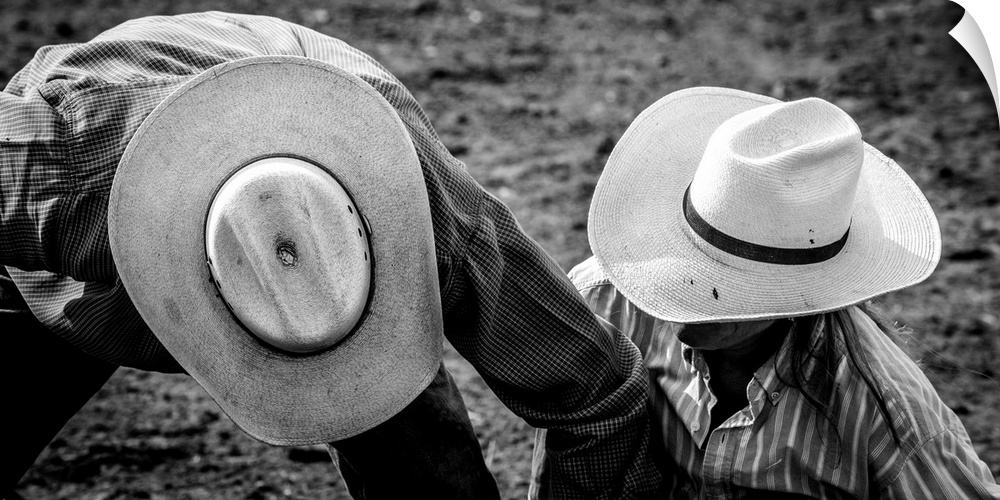 <p>Black and white photograph of two people wearing cowboy hats on the ground at a rodeo.</p>