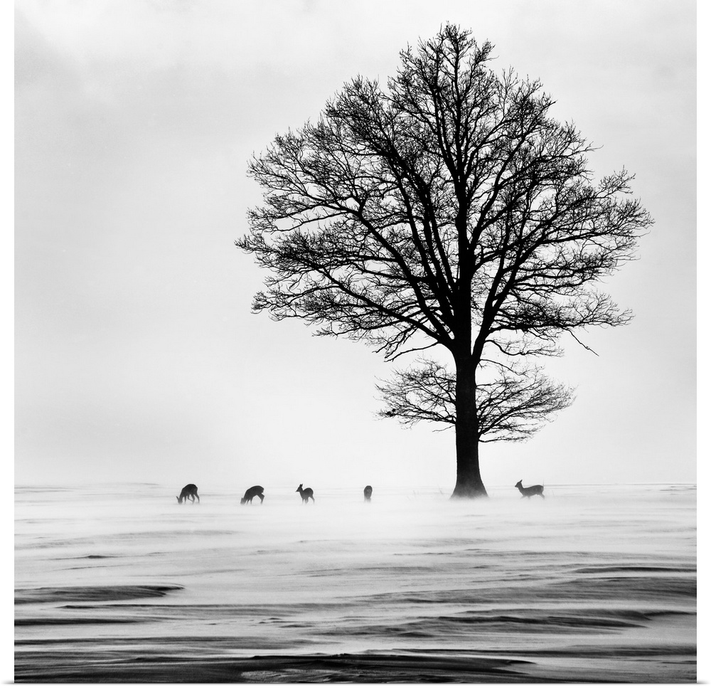 <p>Roe deer under a tree in a winter landscape.</p>
