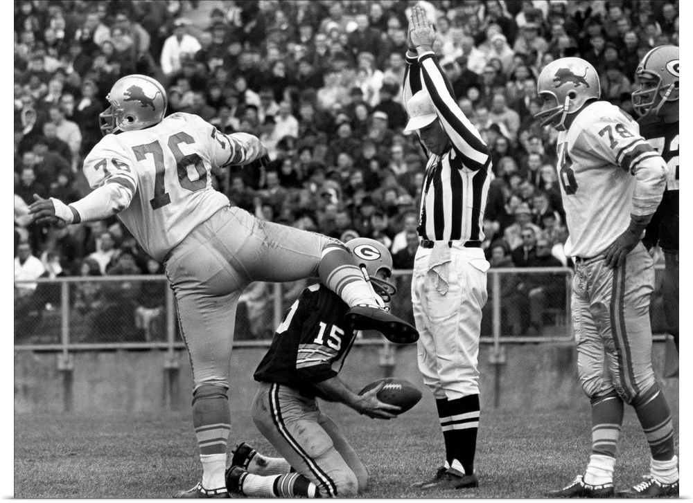 <p>Defensive tackle Roger Brown of the Detroit Lions exults after sacking quarterback Bart Starr of the Green Bay Packers (kneeling) in the end zone for a safety, during a game at Lambeau Field, Green Bay, Wisconsin, 7 November 1965.</p>