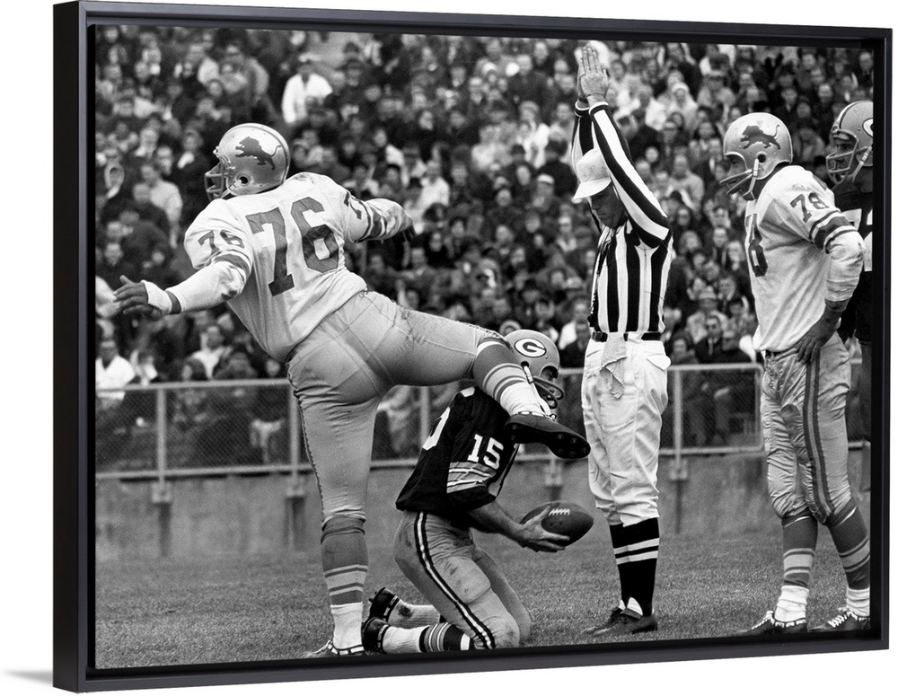 <p>Defensive tackle Roger Brown of the Detroit Lions exults after sacking quarterback Bart Starr of the Green Bay Packers (kneeling) in the end zone for a safety, during a game at Lambeau Field, Green Bay, Wisconsin, 7 November 1965.</p>