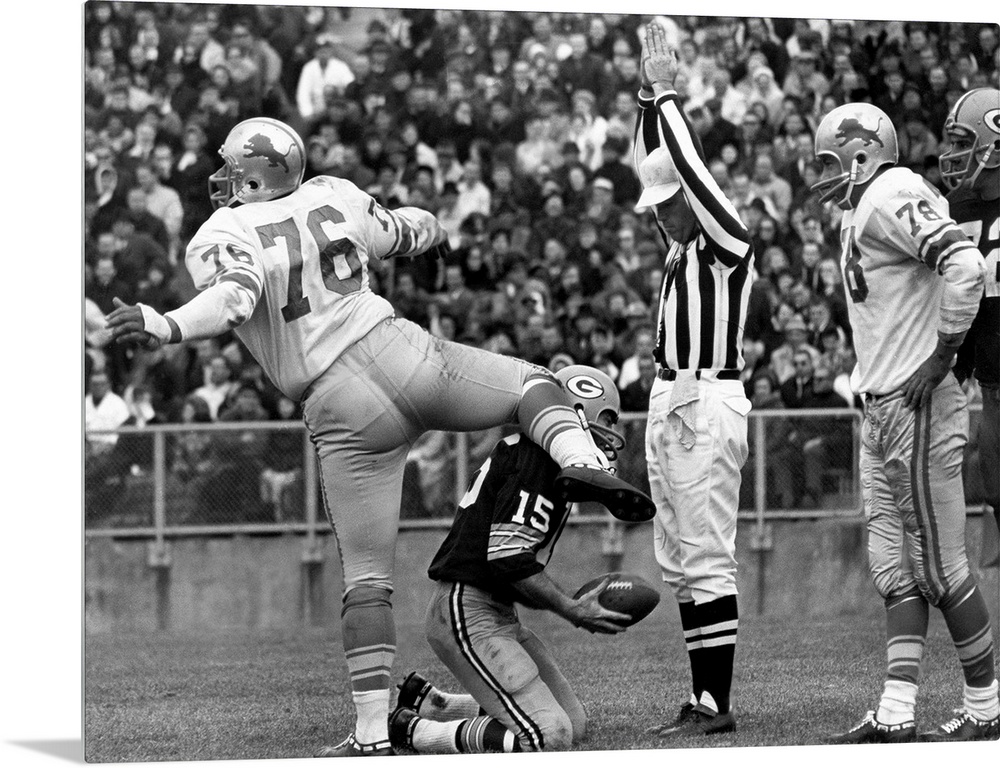 <p>Defensive tackle Roger Brown of the Detroit Lions exults after sacking quarterback Bart Starr of the Green Bay Packers (kneeling) in the end zone for a safety, during a game at Lambeau Field, Green Bay, Wisconsin, 7 November 1965.</p>