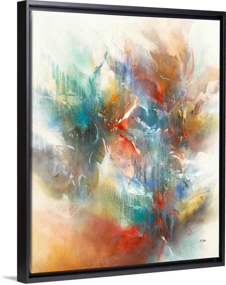 <p>Vibrant abstract painting featuring a dynamic burst of teal, red, blue, yellow, and orange hues with fluid brushstrokes against a light background, evoking energy and organic movement.</p>
