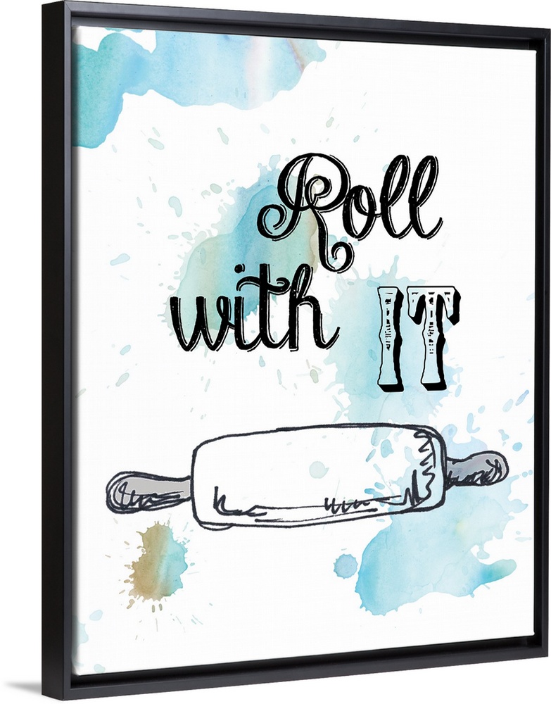 <p>Droplets of blue watercolor on white are the backdrop for the drawing of a rolling pin and the pun "Roll with it" .</p>