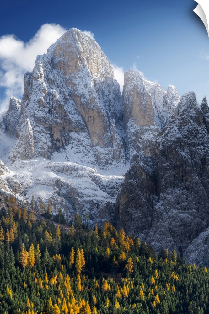 <p>The first snow of the year in late autumn at Rolle Pass, with the majestic Pale di San Martino in the background and the colorful autumnal forest below. Dolomites, Italy.</p>