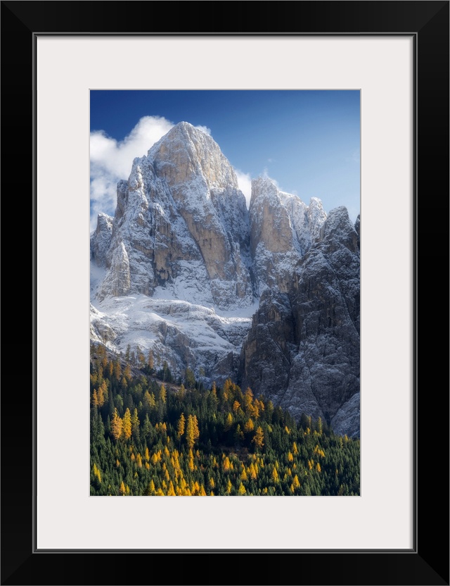 <p>The first snow of the year in late autumn at Rolle Pass, with the majestic Pale di San Martino in the background and the colorful autumnal forest below. Dolomites, Italy.</p>