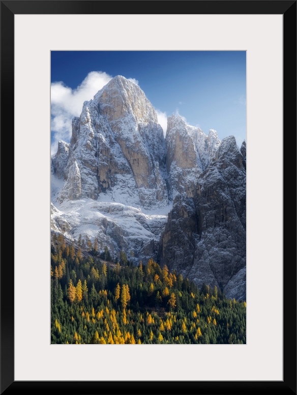 <p>The first snow of the year in late autumn at Rolle Pass, with the majestic Pale di San Martino in the background and the colorful autumnal forest below. Dolomites, Italy.</p>