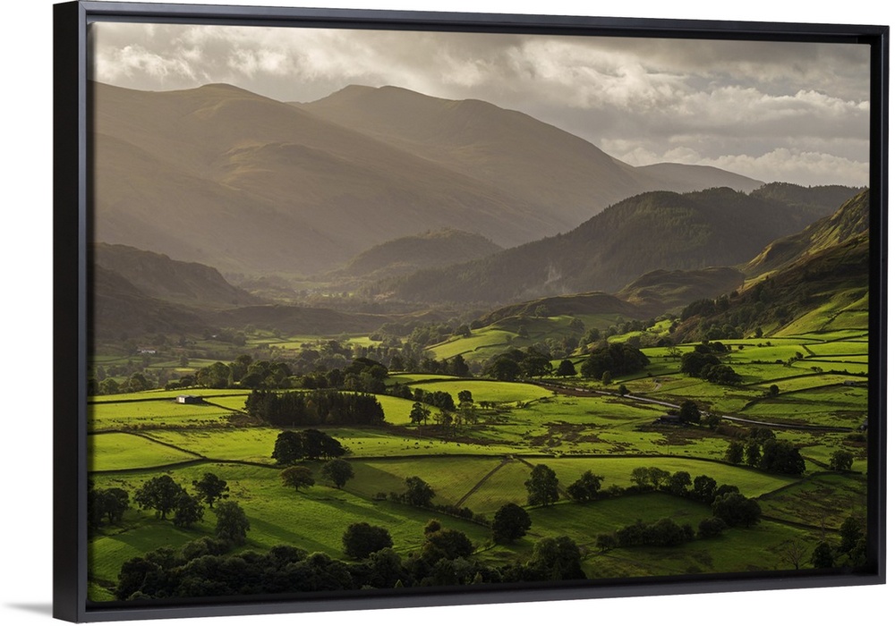 <p>Early morning sunlight illuminates the rolling countryside near Keswick in the Lake District, Cumbria, England. Autumn, September, 2016.</p>