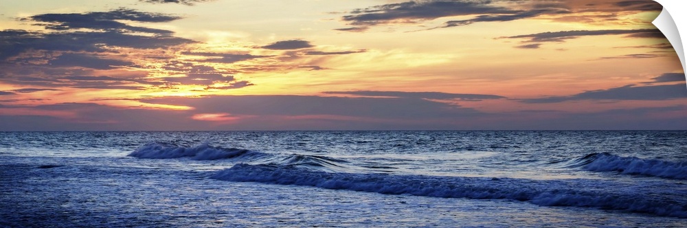 <p>Cloudy sky at sunrise glowing orange over the beach.</p>
