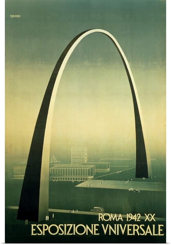 <p>This large commemorative art poster is from the 1942 World's Fair in Rome, Italy. This very cool image shows the amazing Italian ultra modern styling which was way ahead of its time. The St Louis arch was built in 1965 from a design which was submitted in 1948. As this poster illustrates, the Italian design was a centerpiece of the 1942 Rome World's Fair.</p>