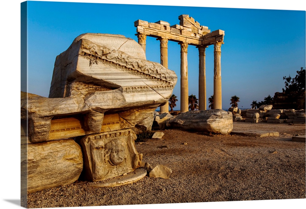 <p>Roman and Hellenistic ruins of the Temple of Apollo under a bright blue sky at sunrise, a ruined Roman entrance, at Side, near Manavgat, on the Mediterranean coast of Anatolia, Side, Anatolia, Turkey</p>