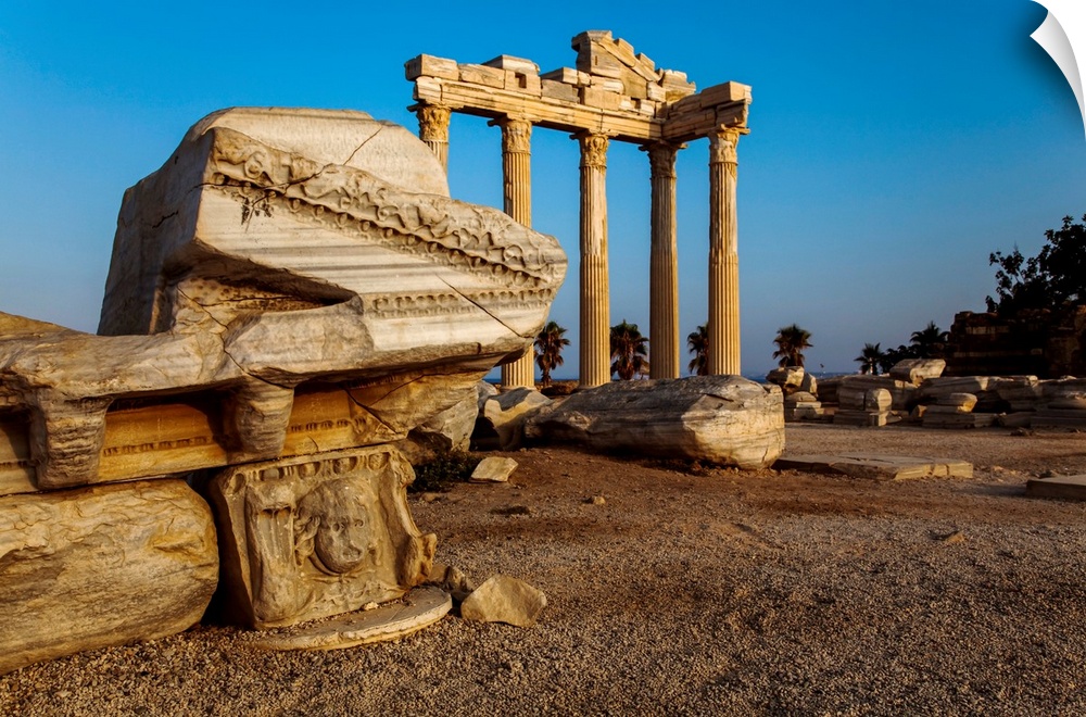 <p>Roman and Hellenistic ruins of the Temple of Apollo under a bright blue sky at sunrise, a ruined Roman entrance, at Side, near Manavgat, on the Mediterranean coast of Anatolia, Side, Anatolia, Turkey</p>