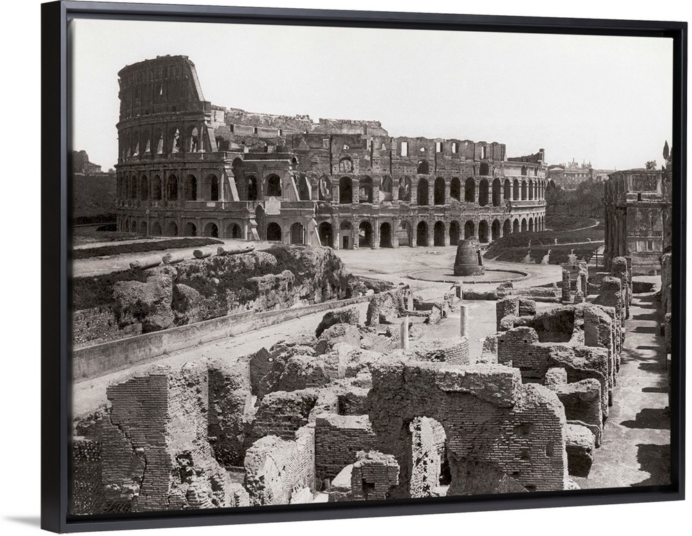 <p>Rome, Italy: A general view of the ruins surrounding the ancient Colosseum and the Colosseum itself, built AD 65-80, under the Emperors Flavian and Titus. Undated photograph.</p>