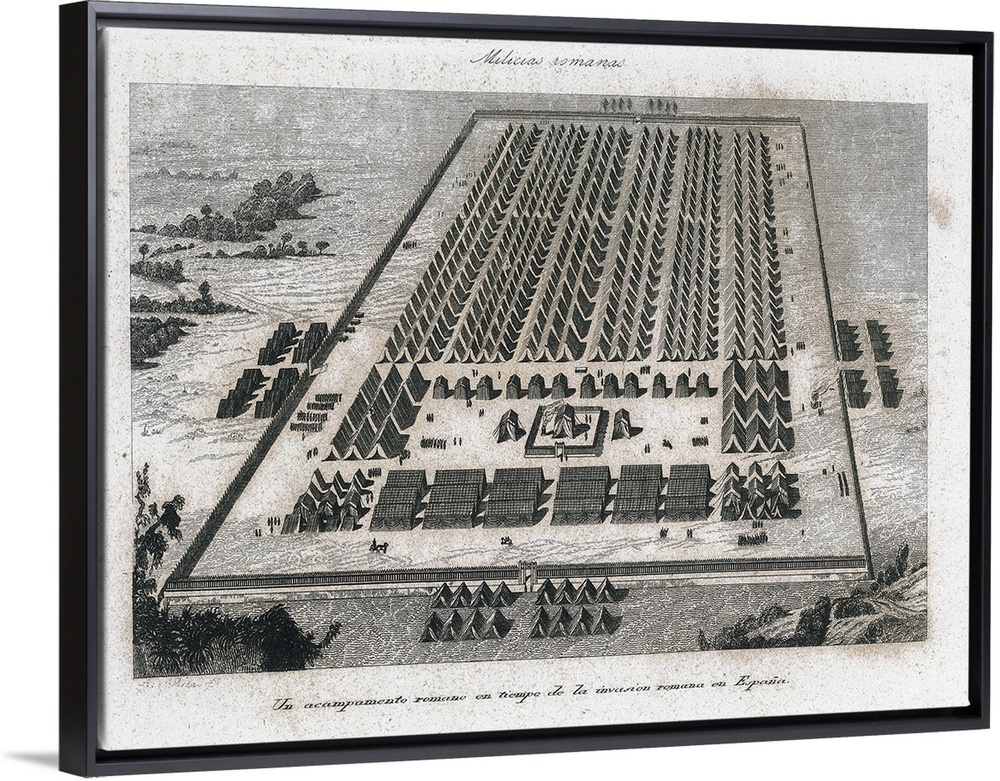 <p>Conquest of Hispania (218 BC-19 BC). Roman militia. A Roman encampment in times of the Roman invasion of Spain. Copper engraving by A. Roca ca. 1840. Engraving. -</p>